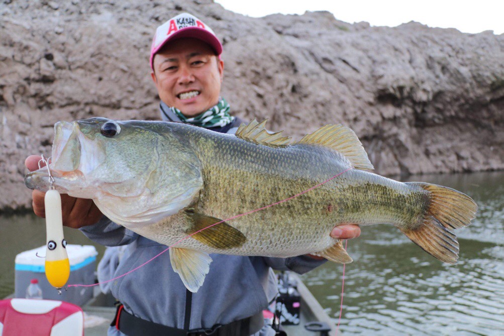 玉越さんが琵琶湖で65cm、5450gのモンスターバスを釣り上げた時の